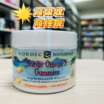 Nordic Omega-3 Gummies hides 68 mg omega-3 EPA+DHA in each tasty, tangerine flavoured gummy.